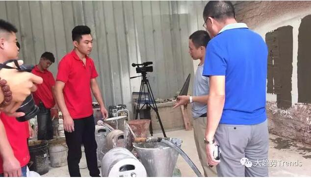 抹灰網程總親臨七彩貝殼營銷中心體驗噴涂機涂刮效果